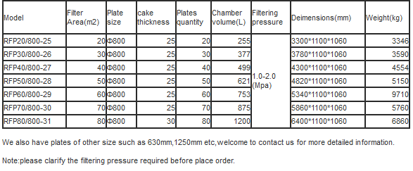 For round filter press,our general specifications are: