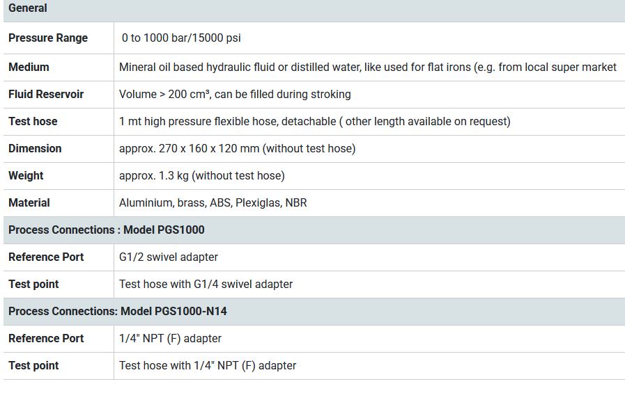 The PGS-1000 hydraulic pressure test pump provide hydraulic pressure up to 1000 bar (15000 psi). It operates both with OIL or WATER