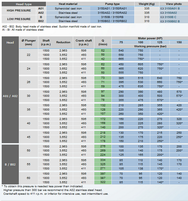 Input shaft left (I) or right viewable from the head. Auxiliary P.T.O. shaft on opposite side. Internal gear box with reduction 2,963 in 3150 body type. Red. 3,652 in 3150R type. Internal oil pressure lubrication. 3150 E / 3150R E Body type. [View photo]. Stroke: 95 mm. Ceramic plungers. High pressure A head made of spheroidal cast iron or stainless steel. Low pressure to high volume B head made of spheroidal cast iron or stainless steel. Internal parts in contact with the liquid made of resistant corrosion materials. Several pressure regulator valves and outlet nipples.