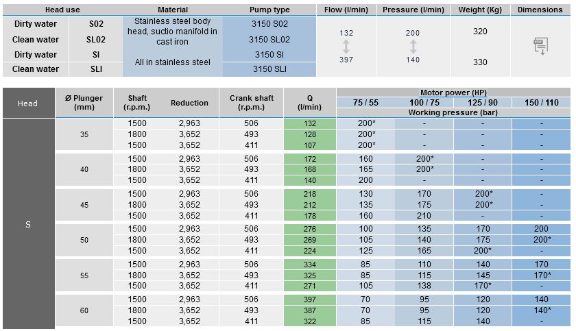 3 plungers 150 HP (110 Kw). Water recycling pump. Input shaft left (I) or right viewable from the head. Auxiliary P.T.O. shaft on opposite side. Internal gear box with reduction 2,963 in 3150 body type. Red. 3,652 in 3150R type. Option: Internal oil pressure lubrication. 3150 E / 3150R E Body type. Stroke: 95 mm. Ceramic plungers. S Valves to use with dirty water. SL Valves to use with clean water. Accessories: Pressure regulator valve, safety valve, manometer and outlet nipples.