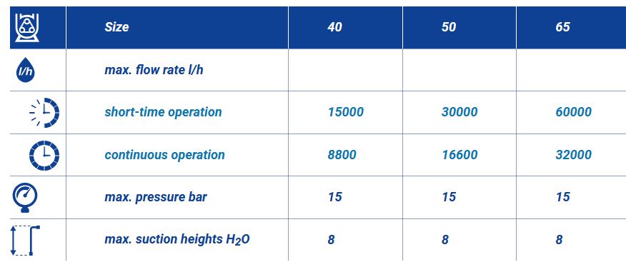 Advantages: Self-priming up to 9,5 m H2O, safe to run dry, absolutely resistent to solids, i.e. ideal for abrasive media, gentle pumping of sensitive media, no seals and valves, pumping of viscous media, ideally suited for aggressive media.