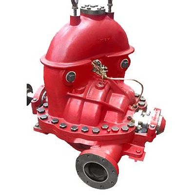 The Sentinel High-Pressure,Two-Stage DMD Fire Pump is engineered for rugged, reliable service and is ideal for installations where space is at a premium. One two-stage unit can produce as much head as two single-stage pumps. Design highlights include single-inlet, enclosed impellers (mounted back-to-back) and an interconnecting passage between stages. Bronze or bronze-bushed interstage pieces guard against wear. Sizes range from 3-in. to 6-in. (7.6-cm to 15.2-cm) discharge for capacities to 1,000 gpm (3,785 litres/min) and heads to 1,150 ft (351 m).