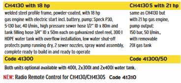 he special advantage of the CH4130is its extremly robust and compactdesign. For mounting in small truckslike Kangoo, Caddy, Berlingo etc. theCH4130is predestinated for quickand trouble-free operation at unbeatable cost-benefit ratio. CH4130is designed for cleaning house connection sewers, ground and grease linesto 300 mm Dia. Warranty*: 2 Years on the complete unit, 4 Years on the frame!*hoses and nozzles excepted.
