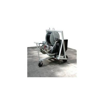Harben Electric A-frame series high-pressure water jetting unit, incorporating a 10-gallon steel water header tank with float valve assembly, mounted on a 3 wheel cart to allow flexible placement of the unit. A 300 ft. capacity manual rewind hose reel will be fitted. Units are available with various pressures and flow to accommodate a variety of tasks.