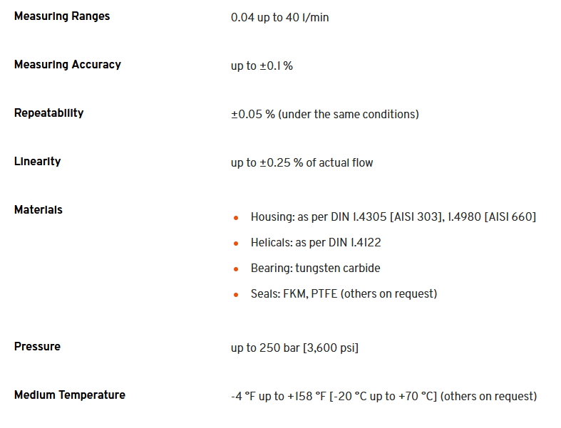 High Resolution Helical Flow Meters with integrated sensor electronics. The High Resolution helical flow meter series is used mainly in applications with highly viscous, abrasive and filled, lubricating and non-lubricating media. Extremely high-resolution electronics integrated in the measuring equipment support the measurement of the smallest dosage quantities in applications with the highest reproducibility requirements. The SRZ High Resolution is intended for precise volume flow measurement in various media. These include adhesives, sealants, and polymers as well as all kinds of greases and oils.