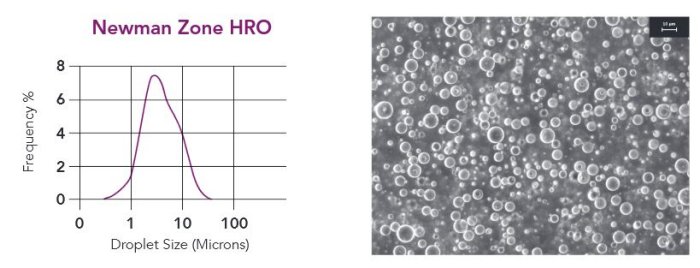 When added to water Newman Zone HRO will immediately bloom into an oil-in-water emulsion. Low shear mixing such as hand shaking in a vial or recirculating in a tank with a centrifugal pump will produce an emulsion with a median droplet size of about 3 microns. 90% of the droplets by volume are under 10 microns.