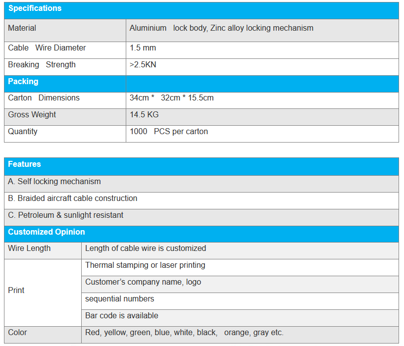High Security Cable Seal C1.5-1 is with 1.5mm adjustable steel wire to pull tight.The cable seals of Jubilee Chinese manufacture are C-TPAT compliant and meets the ISO 17712 standard for High Security Seals, which is tamper proof and tamper evident and have laser printing with logos, barcode and serial number with customized demand. The applications are shipping container, truck trailers, customs, transport and logistics, aircraft cargos, rail cars, tankers, valves, petroleum chemicals, etc.