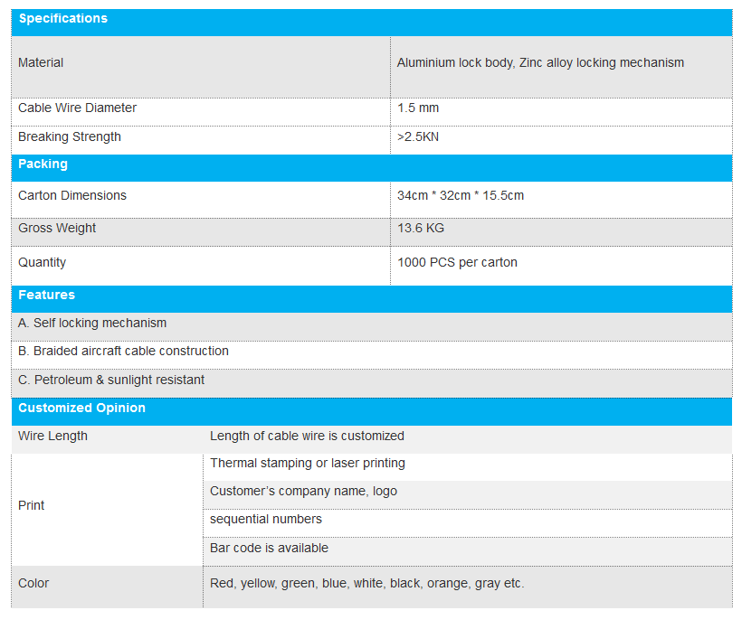 High Security Cable Seal C1.5-2 is with 1.5mm adjustable steel wire to pull tight.The cable seals of Jubilee Chinese manufacture are C-TPAT compliant and meets the ISO 17712 standard for High Security Seals, which is tamper proof and tamper evident and have laser printing with logos, barcode and serial number with customized demand. The applications are shipping container, truck trailers, customs, transport and logistics, aircraft cargos, rail cars, tankers, valves, petroleum chemicals, etc.