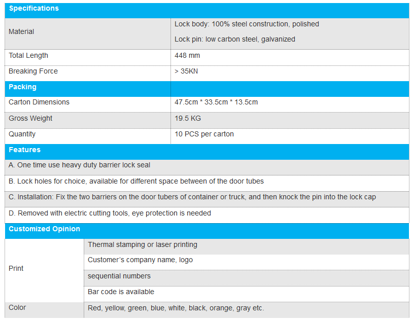 High security container barrier seal CB101 is C-TPAT compliant seal. The container barrier seals are heavy duty steel load locking bar of trailers and containers with good quality made in China, which are tamper proof and tamper evident with very high strength tensile and the laser printing with logos, barcode and serial number upon custom demand. The applications are shipping containers doors, transport truck trailer, container door, cargo trucks logistics, customs, vehicle, etc..
