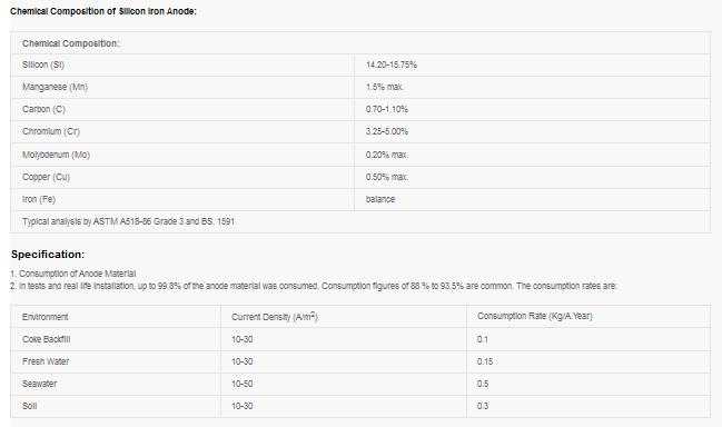 Htgh Silicon cast iron Anodes is a farm of impfessed current anode.lt is one of the most effectrve anode materials in various environments cathodic protection.Thls anodes can operate effectively in a variety of electrolytes, from soil and freshwater to brackish and salt water environments. Both solid or tubular silicon iron anodes are available in corroco company
