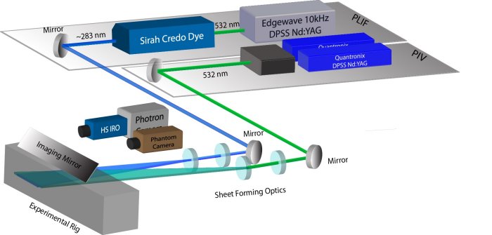Spectral Energies, LLC has extensive experience in assembling fully operational, test-cell-worthy, high-speed planar laser-induced fluorescence (PLIF) and particle-image velocimetry (PIV) systems. The customer need only provide the test article, and SE can deliver the entire PLIF/PIV system, including lasers, cameras, breadboards, software, electronics, and optics. Initial measurements and training can be included in system delivery for a nominal fee.