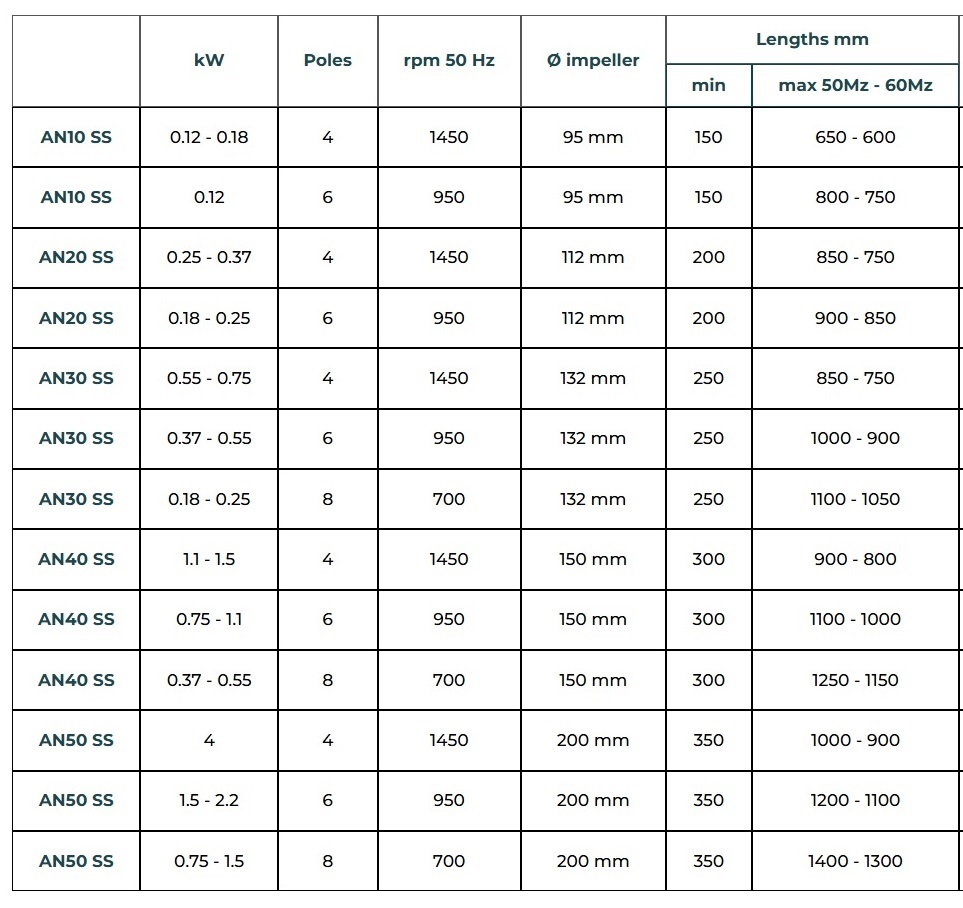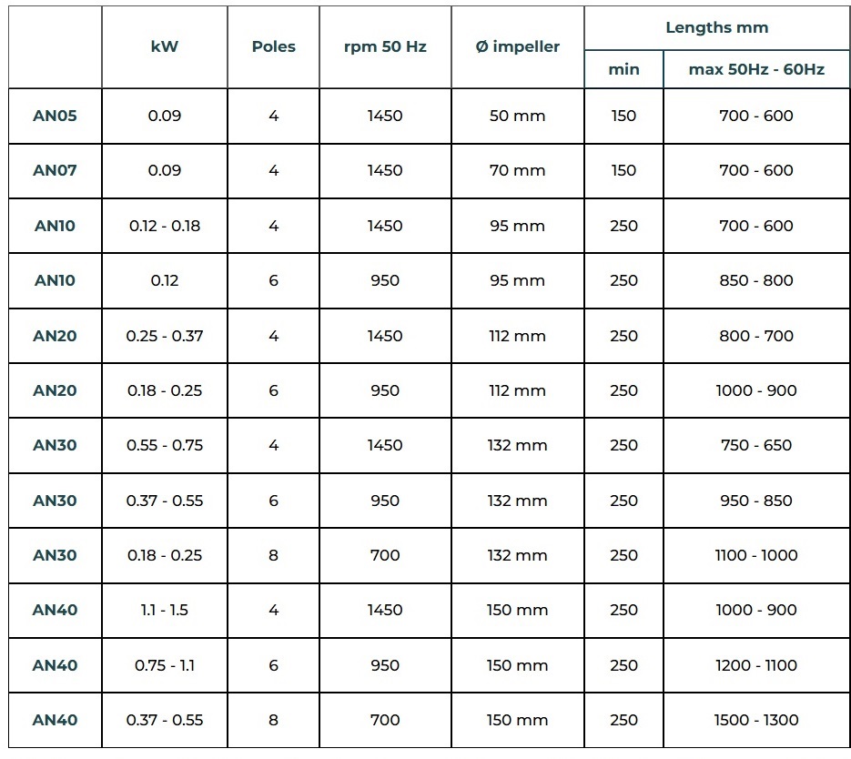 - Propeller materials: PP, PVC, PVDF, INOX.
