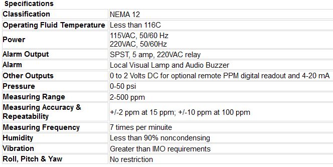 Self-cleaning 15 ppm Oil Content Alarm built with U.S.C.G. and A.B.S. approvals, fulfilling all the requirements of IMO Resolution MEPC.60(33), suitable for detection of oil-in-water from 2ppm to >150ppm. Power requirements: 120VAC, 50/60 Hz at 60 watts. Equipped with a 6 hole #150 Navy flange.