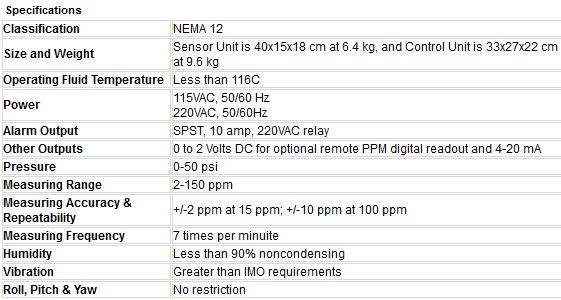 Oil Content Monitor built to USCG/IMO (MEPC.60(33)) requirements; consisting of self cleaning Sensor Unit, Control Unit with built-in Strip Chart Recorder, interconnect cable, Remote Status Indicator, and tech manual.