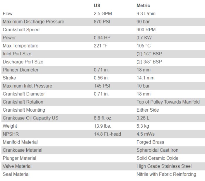 Aluminum crankcase with sight glass and vented dipstick; forged, through-hardened, ground and polished crankshaft; bronze connecting rods; hardened stainless steel plunger bases; solid ceramic plungers; high temperature nitrile seals (with fabric reinforcing); stainless steel valves and forged brass manifold.