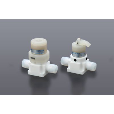 The FCD series fluorine resin valve can handle a maximum fluid temperature of up to 200ºC. The open/close indicator for the pneumatic valve is installed as standard feature and a padlock can be installed into manual valve handle to prevent human error. The toggle handle manual valve opens and shuts in 3 steps and can hold at the second position in between fully closed and fully open.
