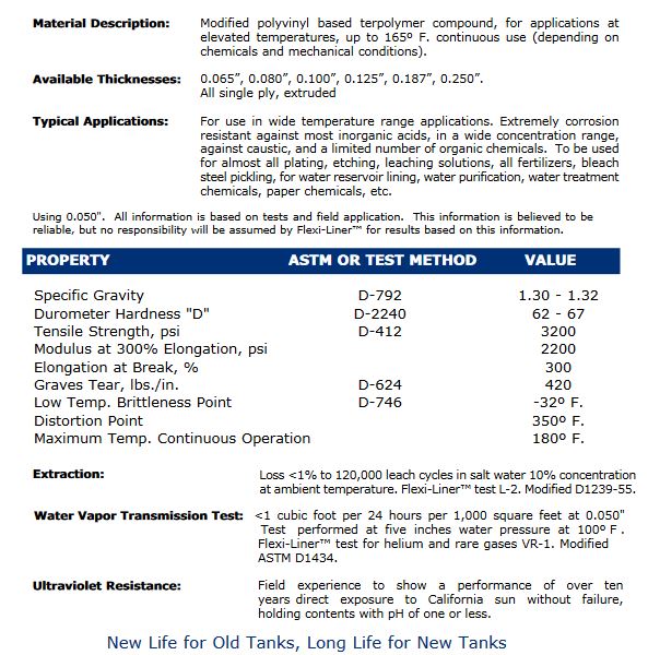Modified polyvinyl based terpolymer compound, for applications atelevated temperatures, up to 165º F. continuous use (depending onchemicals and mechanical conditions).