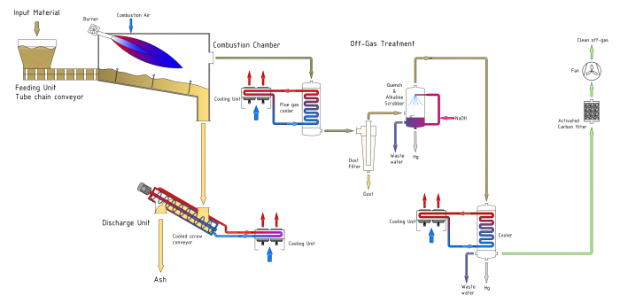 The econ High Temperature Treatment Unit is a continuous process designed for the treatment of catalysts and activated carbon contaminated with mercury, mercury sulphide (HgS), sulphur, and hydrocarbons. The HTTU uses a direct fired thermal oxidation technology for the high temperature (700 - 1000 °C) destruction of mercury compounds and oxidation of sulphur and hydrocarbons. During the process, the material is continuously mixed to ensure homogenous quality. The treated catalysts are discharged and cooled down. After the treatment, the mercury-free catalysts can be sent to downstream metal reclamation. The off-gas is treated in several treatment steps to remove dust, mercury, and S02 from the off-gas stream. An activated carbon filter ensures the emission limits are met at all times. The wastewater generated in the off-gas treatment is treated in a three-step filtration process in which the mercury is removed prior to discharge into the sewage system.