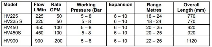 - Flow rates are 225, 450 or 900 LPM
