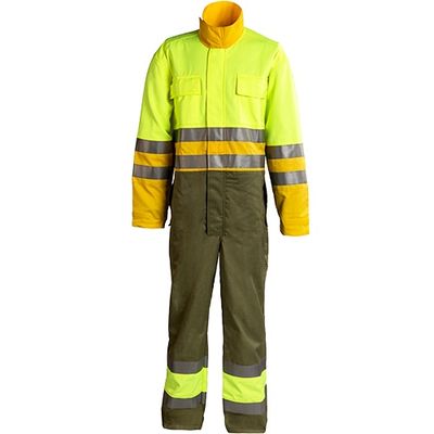 New high visibility fire-retardant three-color one-piece wildland suit. Made for high protection against flames as well as chafing and tearing inherent to wildland use. Fire-retardant cotton inner lining for more protection and breathability.