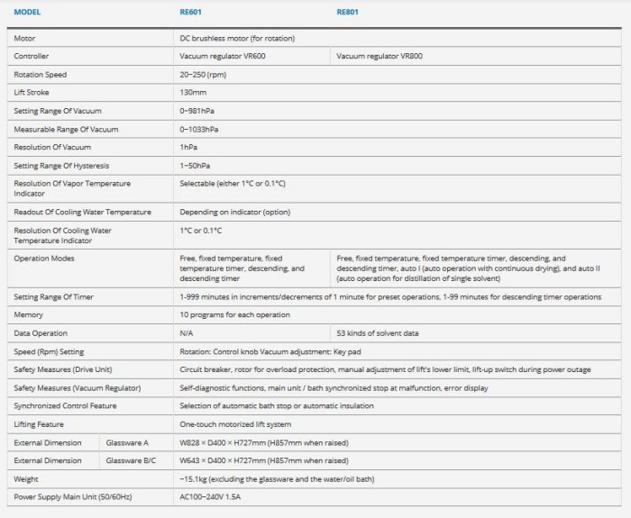 RE601 and RE801 are highly functional and programmable rotary evaporators which are standard equipped with motorized lift, vacuum regulator, vapor temperature display functions and automatic distillation function.