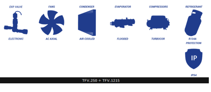 Standard Configuration:. Compressors: Turbocor. Condenser: Air-Cooled, with copper tubes and aluminium finned core. Evaporator: Flooded. Expansion Valve: Electronic. Fans: EC axial. Protection Rating: IP54. Refrigerant: R134a; R1234ze. Cooling Capacities Renge 250kW ÷ 1215kW.