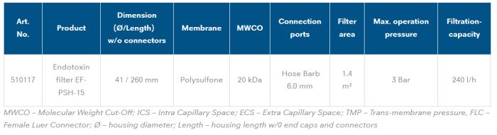 Our hollow fiber filter EF-PSH is the perfect solution for endotoxin applications! This product is single-use and has been integrity tested to ensure it is ready to use. With an effective membrane area of 1.4 m², this filter provides excellent filtration performance.