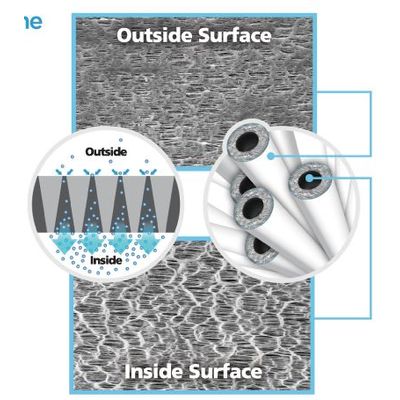 Econity has manufactured hollow fiber membranes out of high density polyethylene (HDPE), without adding any chemical substances. Through a cold stretching, it makes amorphous pores and through a hot stretching, it leads to a great number of pores in appropriate sizes. This will ultimately help with higher tensile strength because of reorientation of polymer structure. Using a different crystallization effect on inside and outside pores of membrane surface, it should be reformed in asymmetric structure, which is a propriety feature. Such HDPE membranes were bom to have a broad range of pH and high durability, so they are utilized for domestic wastewater treatment and an array of industrial applications.