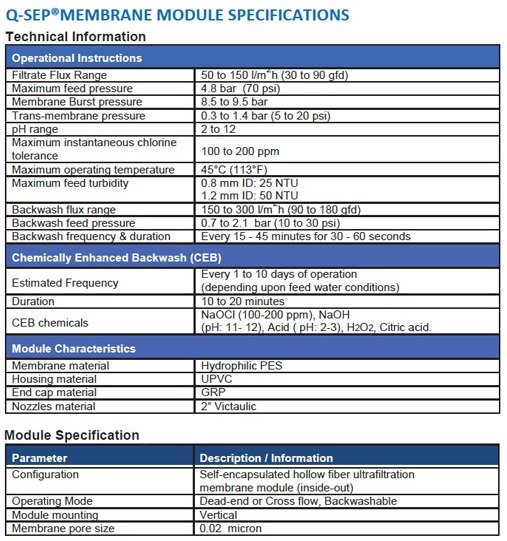 - Configuration: Self encapsulated hollow fiber ultrafiltration membrane module (inside-out)