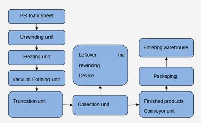 The disposable food container production line was developed by combining domestic and foreign equipment and advantages. The main electrical components, such as a vacuum pump, PLC, made in Japan and Germany, ensure the reliability of the equipment operation. After heating-vacuum forming-cutting-collecting process, the finished PS foaming sheet can be made into the variety of packaging vessels such as fast food box, aquatic plate, supermarket tray, cake tray, KT board, instant noodle bowl, foam tray etc.