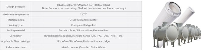 Rizonflow Carbon Steel Filter Housing is designed for installation of each type of high flow filter cartridge. Compared to usual type of vessels, it allows larger size of filter cartridge and it requires less cost. Horizontal design and cordless structure make a quick and easy change out got filter cartridges. Material include carbon steel with rubber liner, carbon steel with PE liner and carbon steel with stainless steel liner.