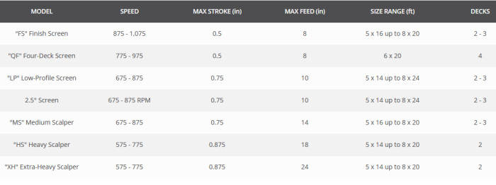 Our horizontal screens deliver high productivity and efficiency in a low-profile package. The low screen height allows for operation in height-restricted areas and for maximum portability. The triple-shaft design employs an oval motion stroke pattern that generates a more aggressive screening action, reducing plugging and blinding while providing extended bearing life. Multiple configurations are available for a wide range of applications, from fine screening to heavy scalping.