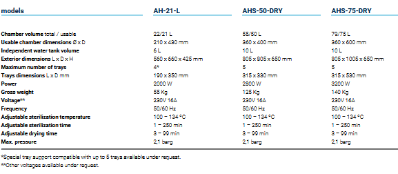 The AHS DRY horizontal benchtop automatic autoclaves deliver great performance for general labware sterilization in many industries, educational and medical facilities and research institutes with the aim of increasing the productivity of the laboratory. The AHS DRY Series are intended for the sterilization of a wide range of solid materials such as unwrapped and wrapped items, small porous objects and hollow ware type B (slightly deep and broad cavities), glass, plastic, metallic objects and waste bags. The drying feature and the automatic water control level reduce operator time dedicated to the autoclave leading to facilitate the sterilization procedures in the general laboratory.