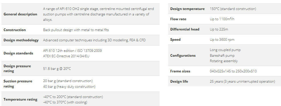 API 610 OH2 12th edition Process Pump for the Oil & Gas Industry. Amarinth API 610 12th edition Process Pump A Series petrochemical process pumps are designed and manufactured for a number of applications including LPG, fuel transfer, produced water and export duties. The pumps are typically found in the oil & gas production and refinery industries, though they can be used for other applications such as seawater and condensate duties. A Series pumps are designed for low NPSH applications and all have independently verified, full ATEX pump compliance.
