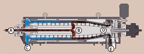 The Centrifuge DECANTER works on the principle of the difference in specific weights between the various materials to separate. Solid particles in suspension in a liquid tend to go down because of the force of gravity. With the decanter, it is possible to reproduce and enhance this process inside a cylinder which rotates at high speed to increase the force of gravity in proportion to the speed, therefore making the separation process almost instantaneous.