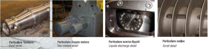 The scroll, in stainless steel, rotates at a slightly different speed than the bowl and conveys the deposited solids toward the conical end of the bowl. This differential speed determines the residence time of the solids in the bowl. Residence time is an important variable for the dry solids content It can be adjusted by changing the differential speed of the scroll thus providing optimal separation. Besides that, by changing the level disks, it is possible to adjust the composition of solids and liquids: a lower level, i.e. when the liquid outlet closer to the machine rotation axis, will allow to obtain an excellent clarified product and a high output at the expense of a more humid solid; a higher level, by adjusting the outlet away from the rotation axis, will guarantee a drier cake at the expense of a cloudy liquid, as the drying area is wider Settled solids are ejected through ports at the conical end of the bowl into the solids housing and fall on a screw conveyor or a belt.