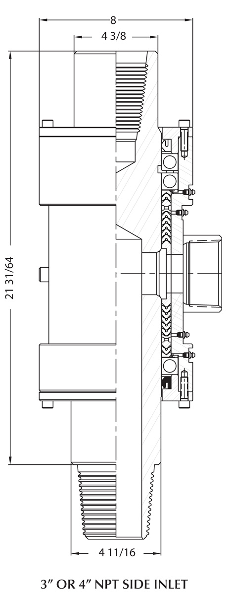 All components used in the manufacture of the Mark V-SI side inlet swivel are of high-grade alloy steel with induction hardened wear areas to extend the life of the expansive stem. The main feature is a rigid mounting of the bearings, mounted in a one-piece housing, eliminating run-out, thus extending the packing and stem life. The strength of the unit is based on the size of the tool joint used on the stem as it is a one-piece design and of high-strength alloy steel.
