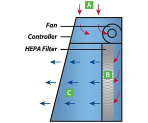 - Air is then forced through a HEPA filter at ?B? where clean Class 100 air exhausts into the work area at ?C? in an even horizontal laminar flow fashion.