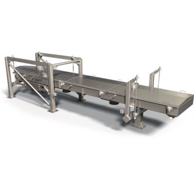 A horizontal motion conveyor that features gentle, quiet, and sanitary horizontal motion conveying for distributing many fragile, seasoned, coated, and frozen food products. Food processing often requires the product flow to be separated into multiple streams for efficient processing. Distribution conveyors control product flow to downstream equipment using gates and diverters to meter the product by the optimal amount. Explore the variety of conveying technology we offer below.