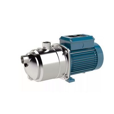 Horizontal multi-stage close coupled pump. Single-piece barrel casing in chrome-nickel stainless steel, with front suction port above pumps axis and radial delivery at top. Stages in Noryl.