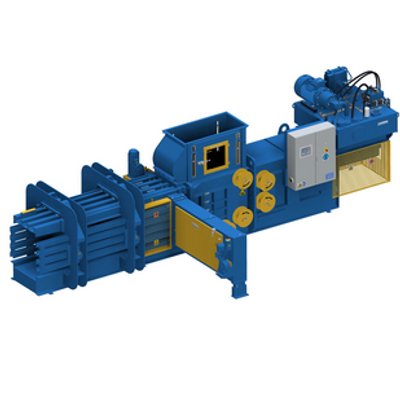 Shear baler suitable for mechanical feeding or when larger feedchute dimensions are required. Ideal in combination with pneumatic and or mechanic waste extraction system.