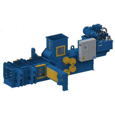 Shear process baler suitable for continuously feeding over pneumatically operating waste systems.
