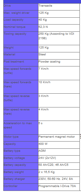 The trike has a programmable steering, where the braking energy is put back into the battery again. This electric powered tug comes with batteries, battery meter, adjustable tiller head, 2 speeds and a battery charger.
