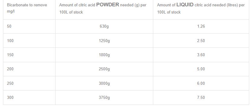 Below is the amount of Citric acid needed to react with bicarbonate in irrigation water per 100 litres of stock solution, for dilution at 1:100 (1%) to produce 10 000 litres of pH adjusted fertigation solution
