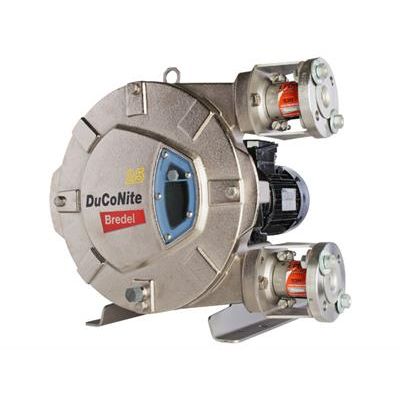 Bredel DuCoNite pumps with a paint-free electroplated housing which protects against corrosive and caustic fluids and atmospheres. Flow rates to 5,250 litre/hour, pressures to 16 bar. DuCoNite pumps are dry running and self-priming, with up to 9.5 metres (30 foot) suction lift capability. Simple hose change decreases cost of ownership, downtime and need for parts inventory. Bredel composite hoses are constructed from high-quality compounded rubbers, reinforced with several layers of braided nylon, and finished by high-precision machining.