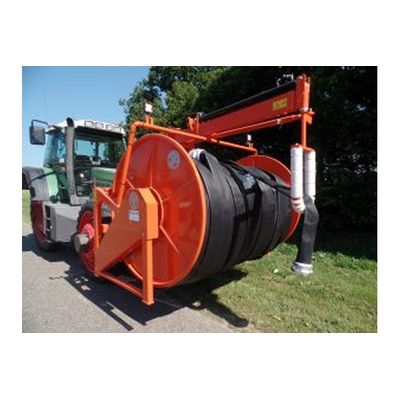 The AP hose reel is developed voor the winding or unwinding of lay-flat hoses for irrigation or drag hose fertilization. The reel is double sided hydraulically driven and provided with a three-point connection. Possibly required front or rear lighting can easily be installed. The hydraulically controlled hose guide enables a simple winding of the hose over the entire width of the reel and discards the hose to a side during unwinding. The core of the drum is supplied on both sides with a pilot hole (⌀230 mm, depth 200 mm) in which the flange coupling can be put.