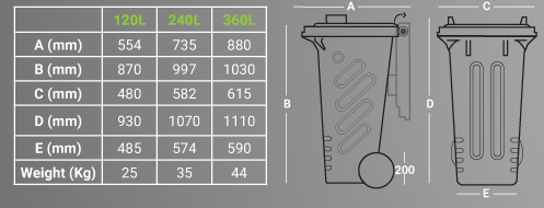 Technical Data: Manufactured from high quality (DC01), deep pressed steel, of appropriate design, to ensure stability and resistance to mechanical stresses. Hot dip galvanized, for maximum protection against corrosion. Conical shape for ease of discharge. EN 4102-1, Fireproof Certified. Capacity: 120L, 240L & 360L