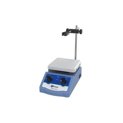 This aluminum top hot plate with stirrer has a powerful, 500W heating element and a 280° C maximum temperature. The unit automatically stops heating when the maximum temperature is reached. Temperature range is from 0 to 280° C. Stirring function operates at speeds from 0 to 1,600 rpm. Aluminum top measures 12 cm x 12 cm. Includes a grounded power cord and spare fuse. Accessories included with the product are a 1” Teflon-coated stir bar and a support stand assembly with a base rod, extender rod, right angle clamp, and thermometer holder. Temperature range is from 0 to 280°C. Stirring speeds from 0 to 1,600 rpm. 12cm x 12cm aluminum top.