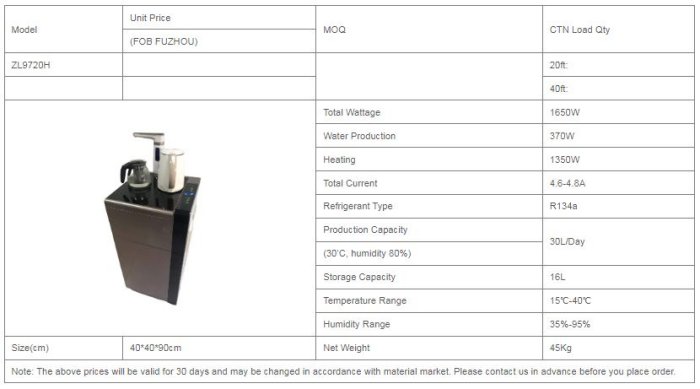 Total Wattage: 1650W. Water Production: 370W. Heating: 1350W. Total Current: 4.6-4.8A. Refrigerant Type: R134a. Production Capacity (30’C, humidity 80%): 30L/Day. Storage Capacity: 16L. Temperature Range: 15?-40?. Humidity Range: 35%-95%. Size(cm): 40*40*90cm. Net Weight: 45Kg.