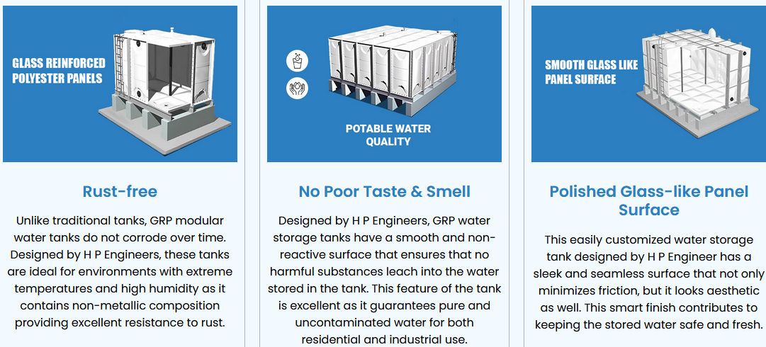H P Engineers designs GRP (Glass Reinforced Plastic) panel tanks. These are both small and large capacity water tanks that come with features like durability, long-term functionality, and corrosion-resistant. Not only this, the GRP water storage tank can be used from agricultural irrigation to large-scale industrial applications because these tanks provide a reliable storage solution for different water volumes. In addition, these tanks are versatile in design and function as they can be used in harsh environments, which makes it a perfect solution for both rural and urban water storage needs.